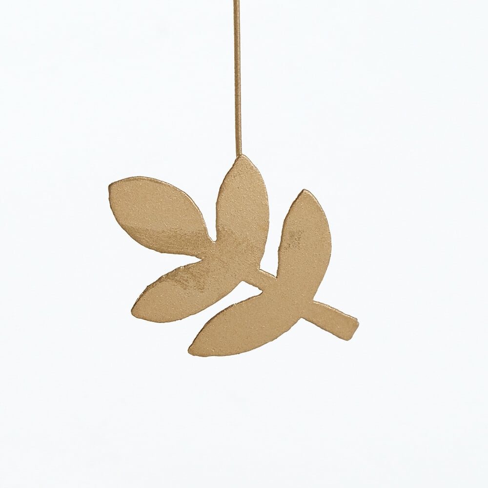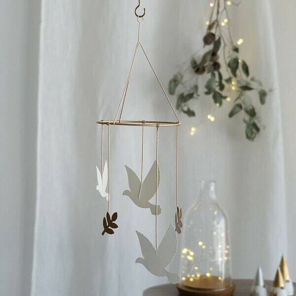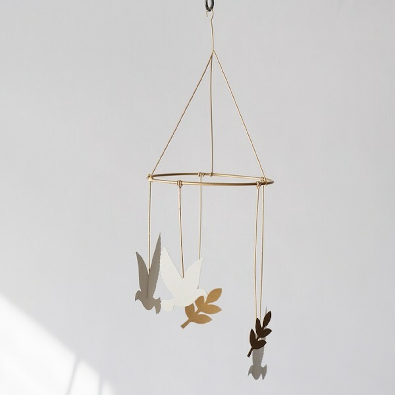 平和の象徴であるハトとオリーブをモチーフにしたブリキのモビール。