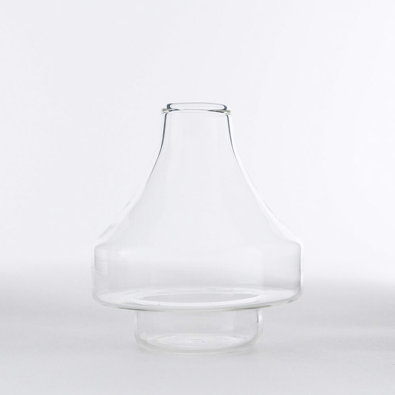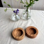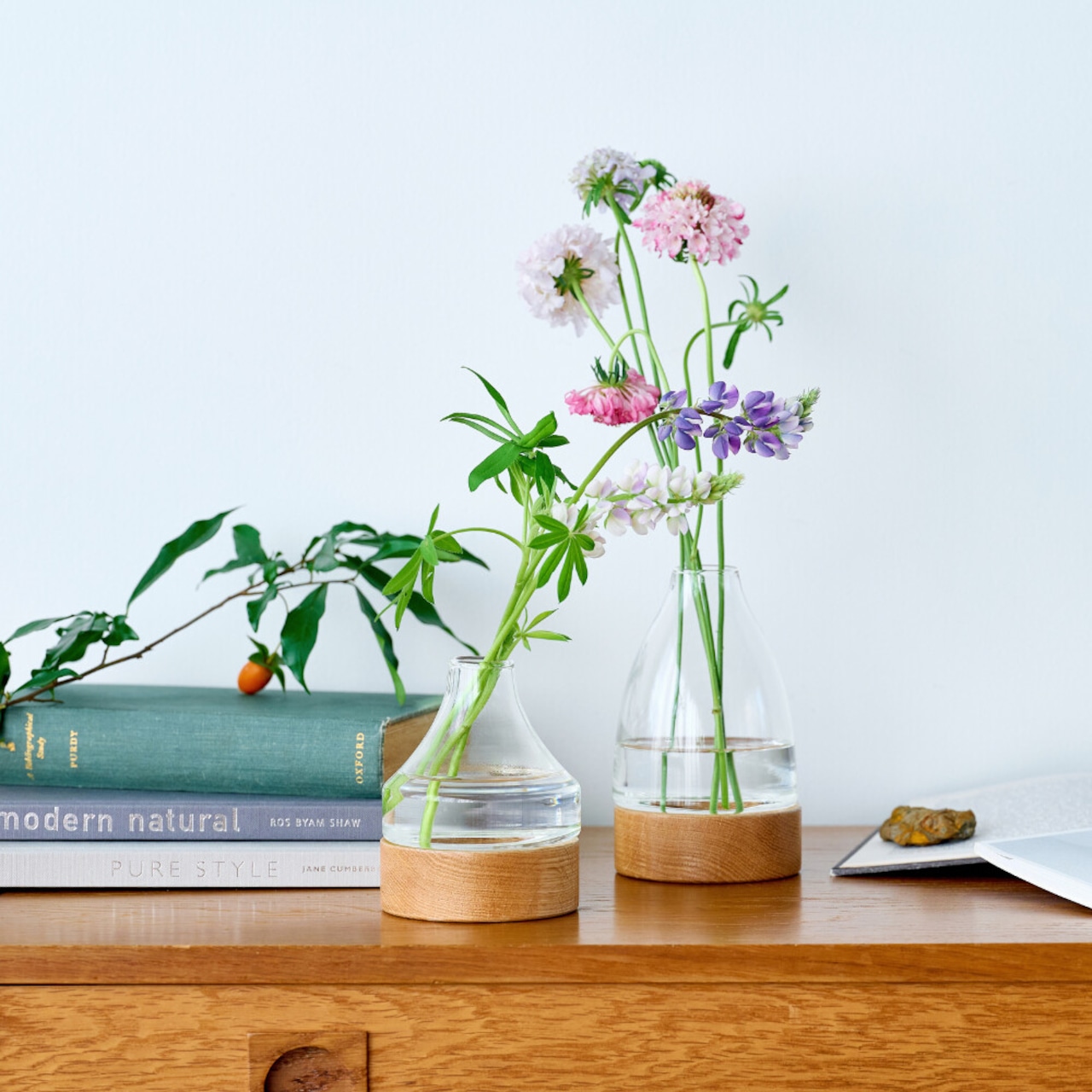 ウッドベースを使ったリューズガラスのフラワーベース。少ない本数でもバランスよく生けられるサイズとデザインにしています。